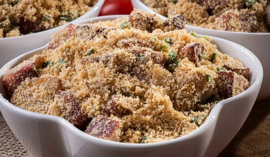 Farfora is a Brazilian dish with a smoky flavor. It is also very salty and made with pieces of fried bacon and cassava flour and is served with rice and beans to create a delicious meal.